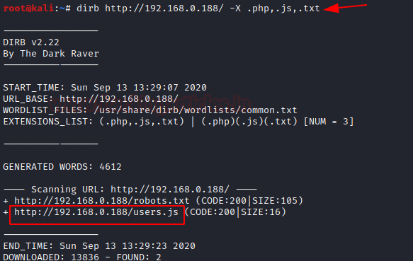 dirb http://192.168.0.188/ -X .php,.js,.txt