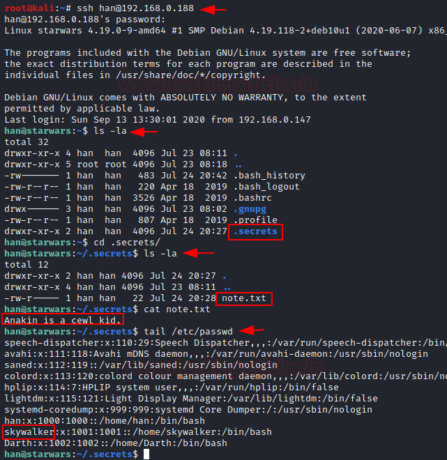 Further, we check passwd file for enumerating user account and we saw han, starwalker & Darth as usernames.