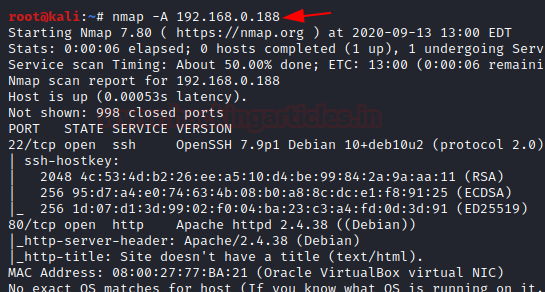 As we got our target IP address for the machine (192.168.0.188), And now that we know our target IP, let’s scan it with the help of Nmap and move forward with the process of information gathering on the target host. In the following command, “-A” means Aggressive scanning.
