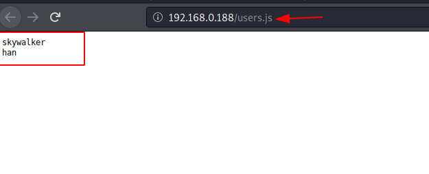 And from the result of the above command, we found user.js, let’s explore this. When we opened the user.js in the browser, two entries which could the usernames: skywalker and han were found.