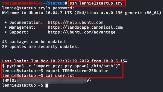 After authenticating with user “lennie” via SSH, we gain access to his house and read the “user.txt” flag.
