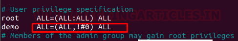 So basically, here the demo is defined to execute ALL commands. As ALL (User, Group) other than root (User, Group), and “ALL,!root” is a misconfiguration and causes security loopholes. Because the user demo is restricted to performing the task as root, but not as an admin. As a result, he can run a command as an administrator (user “root”).