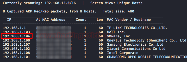 We begin by scanning our network for the target machine using Netdiscover. The target machine is active on 192.168.1.104