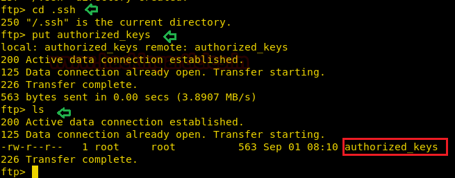 As we already have FTP access of the host machine, therefore, it becomes easy to for us to upload authorized_keys inside the .ssh directory which we have created earlier.