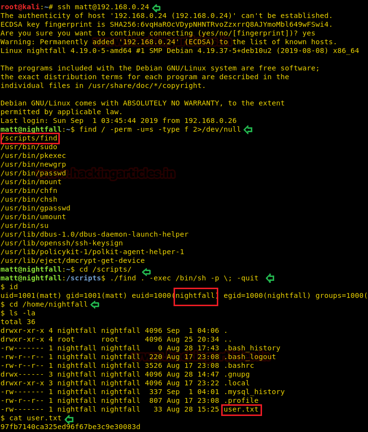 So, we found /script/find has SUID permissions and it works similarly as Linux-Find utility thus we try to execute /bin/sh command and obtained access of the nightfall shell.