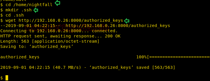 But this was limited shell thus to access proper shell as nightfall, we try to apply the previous approach of placing blank passphrase ssh key. Therefore inside /home/nightfall we created a .ssh named folder and upload the authorized_key which we had created previously.