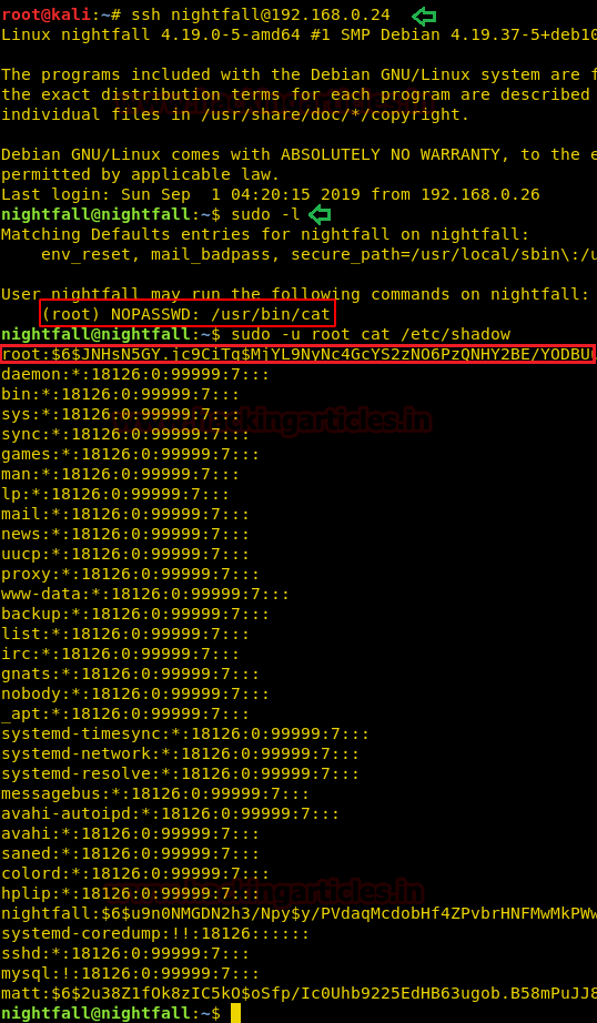 Now repeat the same and try to connect with ssh as nightfall and you will get ssh shell, like us as shown in below image. Further, we check sudo right for nightfall and observed he has sudo right for cat program which means we can read higher privilege files such as the shadow.