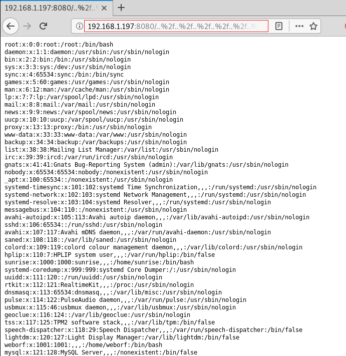 We went to our Web Browser and in the URL, we injected the line that was displayed by the exploit. This machine is indeed vulnerable to Directory Traversal. Figures! We can read the /etc/passwd file.