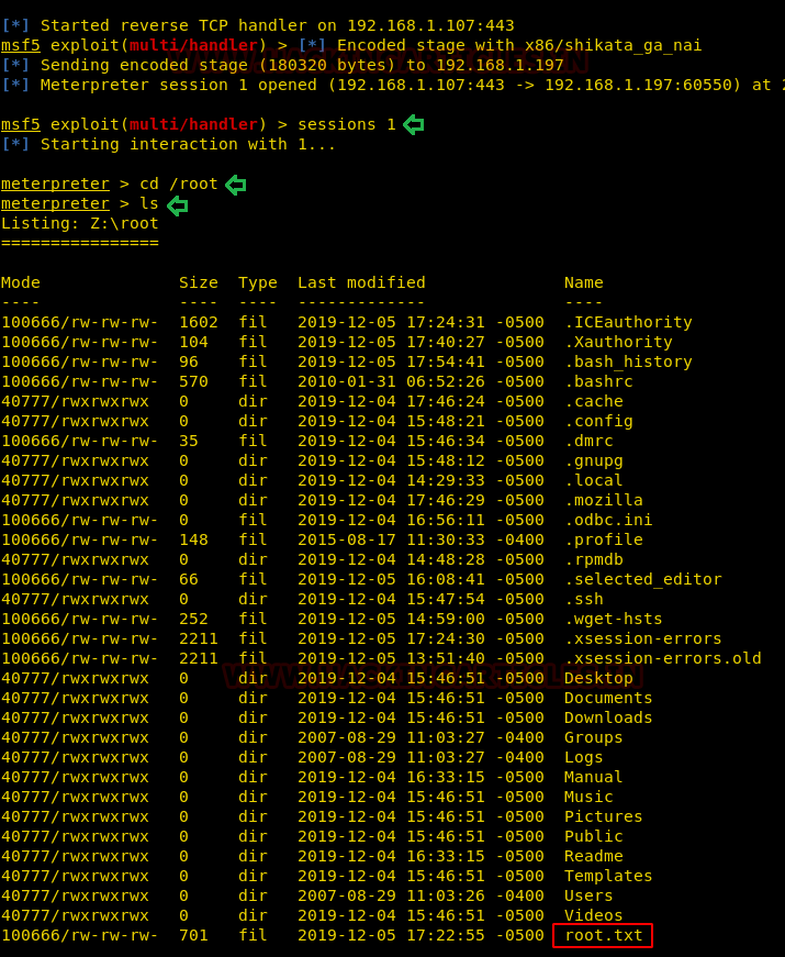 When we used the msfpc tool to generate the payload, a Metasploit Framework ruby file is also generated with the configuration that is required to run the listener for the payload. We ran that ruby file and when we ran the file using wine on that target machine. We see that a meterpreter session pops up. As the file was executed with wine which was had root privileges the shell, we got was root as well. We traverse into the root directory and when we list all the files inside this directory, we see that we find a file named root.txt.