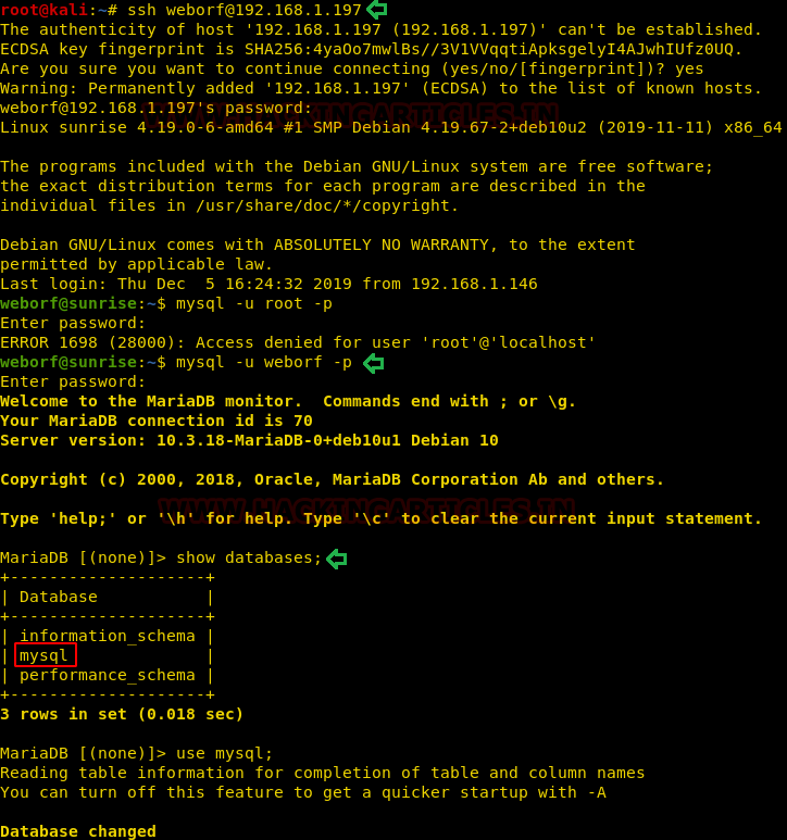We have successfully gained the credentials of the user Weborf. Since from the earlier nmap scan we saw that we have ssh port open. Let’s try to ssh our way in. After getting in the target machine, we started the enumeration based on the information we had from our initial scanning that there is a MySQL service running on the system. We login it to MySQL using the Weborf credentials. We run the “show databases;” command to get the name of databases.