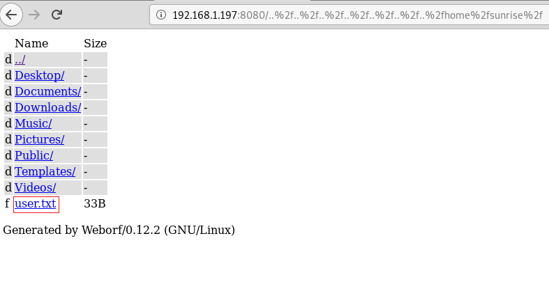 Now that we have a method to look around for files inside the target machine. We decided to take a loot at the user sunrise’s home directory. And we came across a user.txt file.