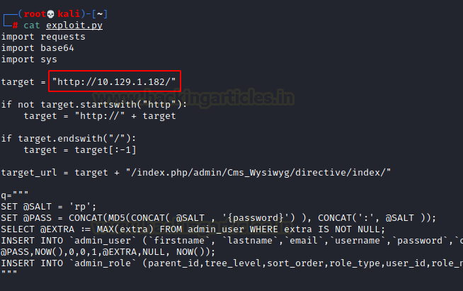 One of the vulnerabilities we found on ExploitDB was Remote Code Execution. Get the RCE Script from here. We download the script from ExploitDB and edit it to add the Target IP Address.