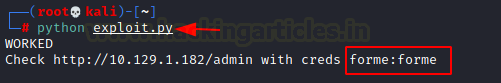 This script basically checks is the Magneto is vulnerable and if it is vulnerable it exploits the Remote Code Execution Vulnerability to create an Administrator level user by the name of forme. We ran the script and it was successful.