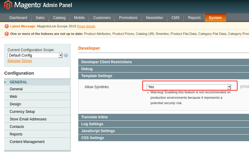 Now, we are in the Magento Admin Panel. There are a bunch of different methods in which we can get the shell but we decided to use the “Froghopper” Attack. It is a File Upload attack. It got its name from the pepe frog image that was used as a meme to get the shell by the author of the exploit. The files uploaded are not accessible in their raw form which will prevent us from executing them. This can be bypassed by allowing Symlinks in Developer Settings (System > Configuration > developer > Template Settings)