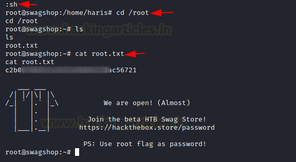 We executed the shell as shown in the image below and got the root shell. All that’s left is to read the root flag. We found it /root. This concludes the machine.