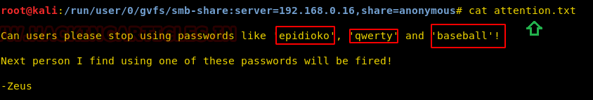 So, in this shared folder I found a text file that I had explored here as shown below. The /attention.txt file gave some hint for user password as highlighted in the image. Hopefully, we can use any of these passwords to access a shared folder /helios.