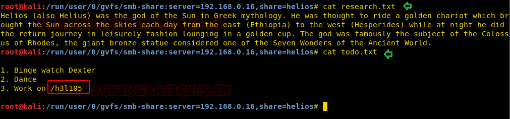 Further, I try to access /helios using “qwerty” as login password and then I explored other files research.txt and todo.txt, although the research.txt was not much helpful but todo.txt gave a hint for /h3l105 that could be web file or web directory.
