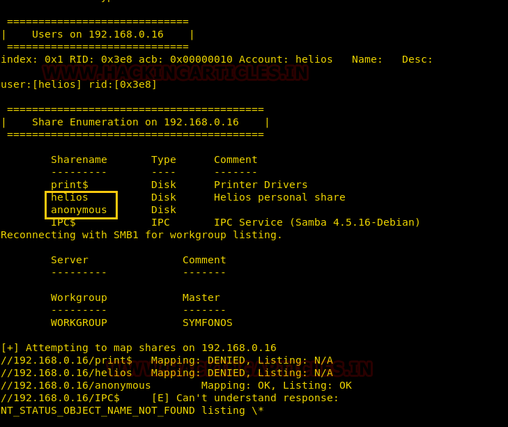 After scanning, we go to network enumeration and for that I used enum4linux. Here I found a user account helios and share directory /anonymous & /helios