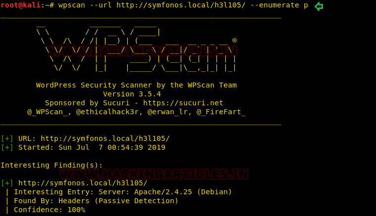 wpscan --url http://symfonos.local/h3l105/ --enumerate p