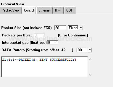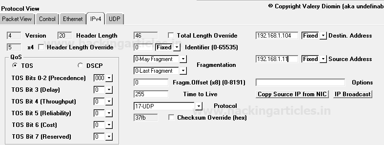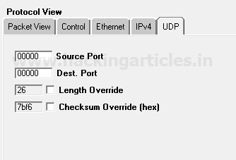 Now explore the UDP tab for design UDP packets as per your requirement, from given below image you can observe default setting details.