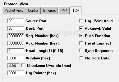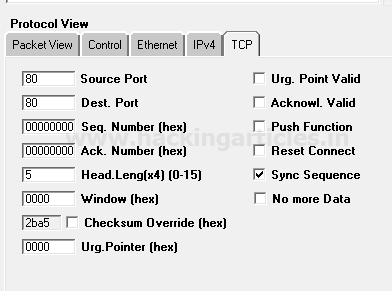 As we know TCP protocol uses TCP-flag for communication to established connection with Destination IP. Therefore we are crafting TCP-SYN packet under the third section protocol view -> TCP by enabling sync sequence option which flows from source port 80 to destination port 80.