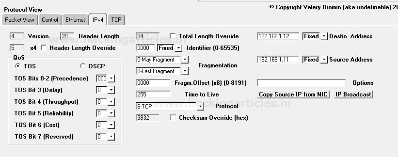 So as we know in Packet Assembly phase we need to decide protocol for crafting any packet, which is quite easy to select with this tool. Only enable the radio button for selecting protocol and direction flow of packet. Here I had enabled radio buttons for “IPv4” and “TCP” without disturbing remaining default packet flow as shown given below image.