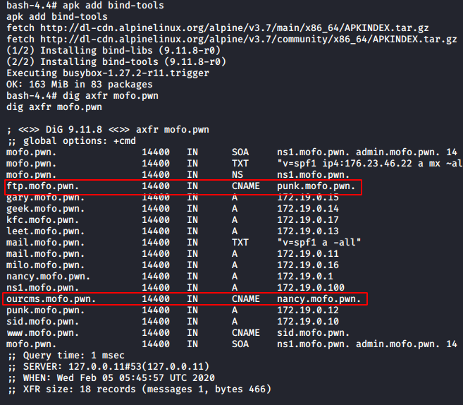 It was quite possible this might be the host that would lead us to the CMS. To confirm our suspicions, we decided to use the bind tools. As they were not installed, we used the apk add command to install those. After that, we ran the dig command and found the host that we were looking for. ourcms.mofo.pwn seems to be the host that would take us to the CMS that we need.