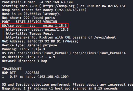We found the target’s IP Address 192.168.43.100. The next step is to scan the target machine by using the Nmap tool. This is to find the open ports and services on the target machine and will help us to proceed further