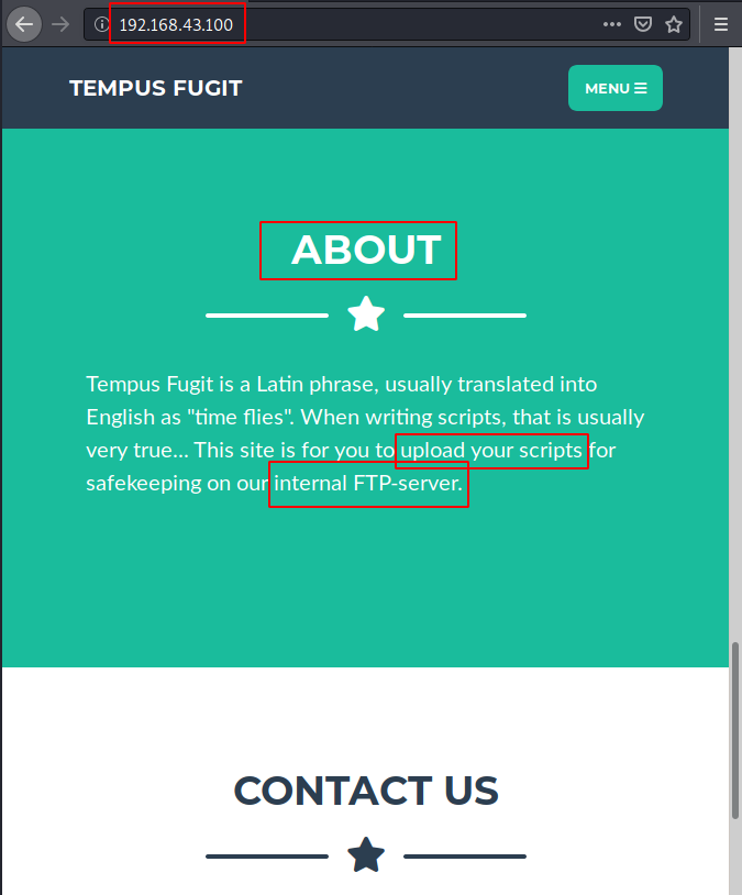It was in the About section, it tells us the meaning of the word Tempus Fugit which really translates to “Time Flies”. The message also informs that this webpage was designed to upload some scripts onto an internal FTP server. Now all we need to find that upload option. It was on the menu of the webpage. After enumerating for a while, it was clear that this upload option was white-listed. Only .txt and .rtf extensions were allowed. After an exhaustive list of ways to upload any kind of shell but we were unsuccessful. Now it hit us that we could try command injection through this upload option. We tried the very basic injection with “;whoami”. For this we intercepted the request on the “Upload!” and added the injection text in the filename field as shown in the image given below. After this, we forwarded the request to the Target Machine Server.