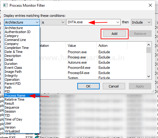Select the Attribute to Process Name is DVTA.exe because this is the only process that what we’re interested in and ADD the filter.
