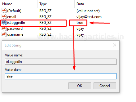 It will open up the Registry entry. As we can see it has a couple of keys like Email, Is Logged in, Password, and Username. So basically, this application is storing the credentials here and it is also checking if the user is already logged in or not.
