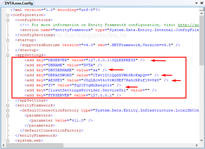 Apart from these entries here we have some other interesting entries if you notice there is a database name which is DVTA … if you remember this is the name of the database we have used when creating a database in SQL Server Express. Also, there is the user name and the password for the database but it seems like the password is Encrypted but if you observe just right below that there is an AES encryption key possibly used for decrypting the Encrypted value and apart from that there is IV value which is probably used with the AES Encryption.