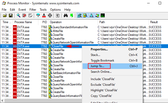 so, it looks like these files are something which is being accessed by DVTA.exe when we try configuring the IP address. So quickly open it up and see what it has. We can directly jump from process monitor to the location of this file by giving it a right-click and then navigate to Jump TO…
