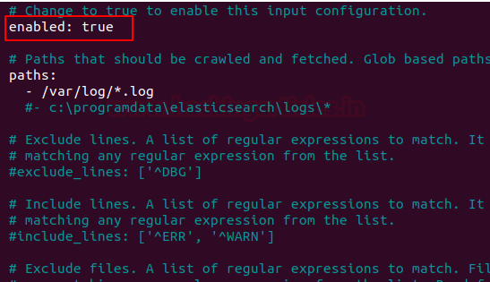 we’re going to use Elasticsearch to perform additional processing on data collected by filebeat. Therefore, Enable the filebeat prospectors by changing the ‘enabled’ line value to ‘true’.