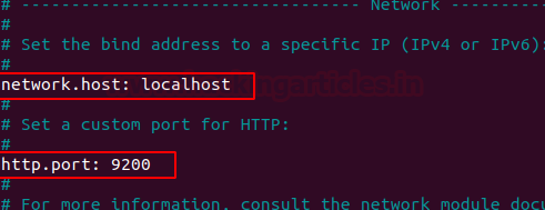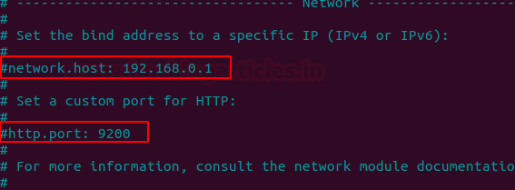 Find the line that specifies network.host attribute and uncomment it and add localhost as its value and also uncomment http.port attribute.