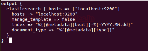 output { elasticsearch { hosts => ["localhost:9200"] hosts => "localhost:9200" manage_template => false index => "%{[@metadata][beat]}-%{+YYYY.MM.dd}" document_type => "%{[@metadata][type]}" } }