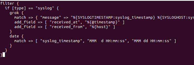 filter { if [type] == "syslog" { grok { match => { "message" => "%{SYSLOGTIMESTAMP:syslog_timestamp} %{SYSLOGHOST:syslog_hostname} %{DATA:syslog_program}(?:\[%{POSINT:syslog_pid}\])?: %{GREEDYDATA:syslog_message}" } add_field => [ "received_at", "%{@timestamp}" ] add_field => [ "received_from", "%{host}" ] } date { match => [ "syslog_timestamp", "MMM d HH:mm:ss", "MMM dd HH:mm:ss" ] } } }