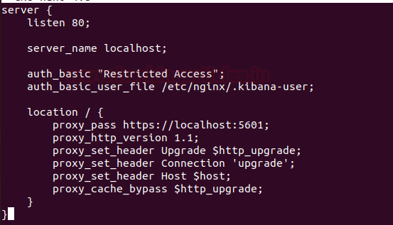 server { listen 80; server_name localhost; auth_basic "Restricted Access"; auth_basic_user_file /etc/nginx/.kibana-user; location / { proxy_pass https://localhost:5601; proxy_http_version 1.1; proxy_set_header Upgrade $http_upgrade; proxy_set_header Connection 'upgrade'; proxy_set_header Host $host; proxy_cache_bypass $http_upgrade; } }