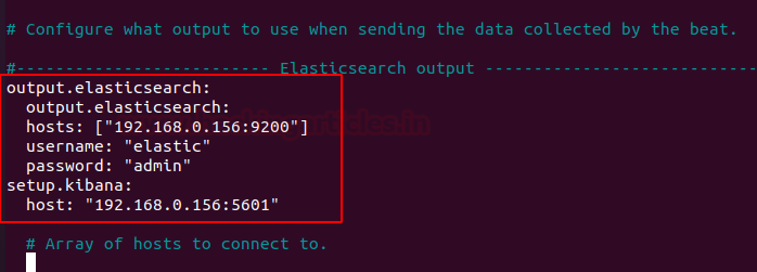 hosts: ["192.168.0.156:9200"] username: "elastic" password: "123" setup.kibana: host: "192.168.0.156:5601"
