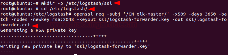 mkdir -p /etc/logstash/ssl cd /etc/logstash/ openssl req -subj '/CN=elk-master/' -x509 -days 3650 -batch -nodes -newkey rsa:2048 -keyout ssl/logstash-forwarder.key -out ssl/logstash-forwarder.crt