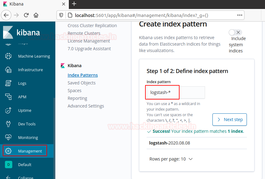 Go to the management section and create an index pattern called logstash-* and proceed for the next step.
